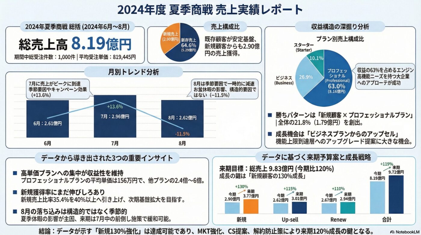 現代のビジネス環境において、データ分析は意思決定に不可欠です。しかし、多くのビジネスパーソンが、複雑なExcelデータの整理や、そこから導き出される洞察に基づいたレポート・プレゼン資料の作成に膨大な時間を費やしています。