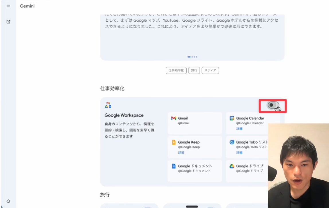 この設定は一度行えば完了し、以降はGeminiとの対話を通じて、Google Workspaceの各アプリと連携した操作が可能になります。