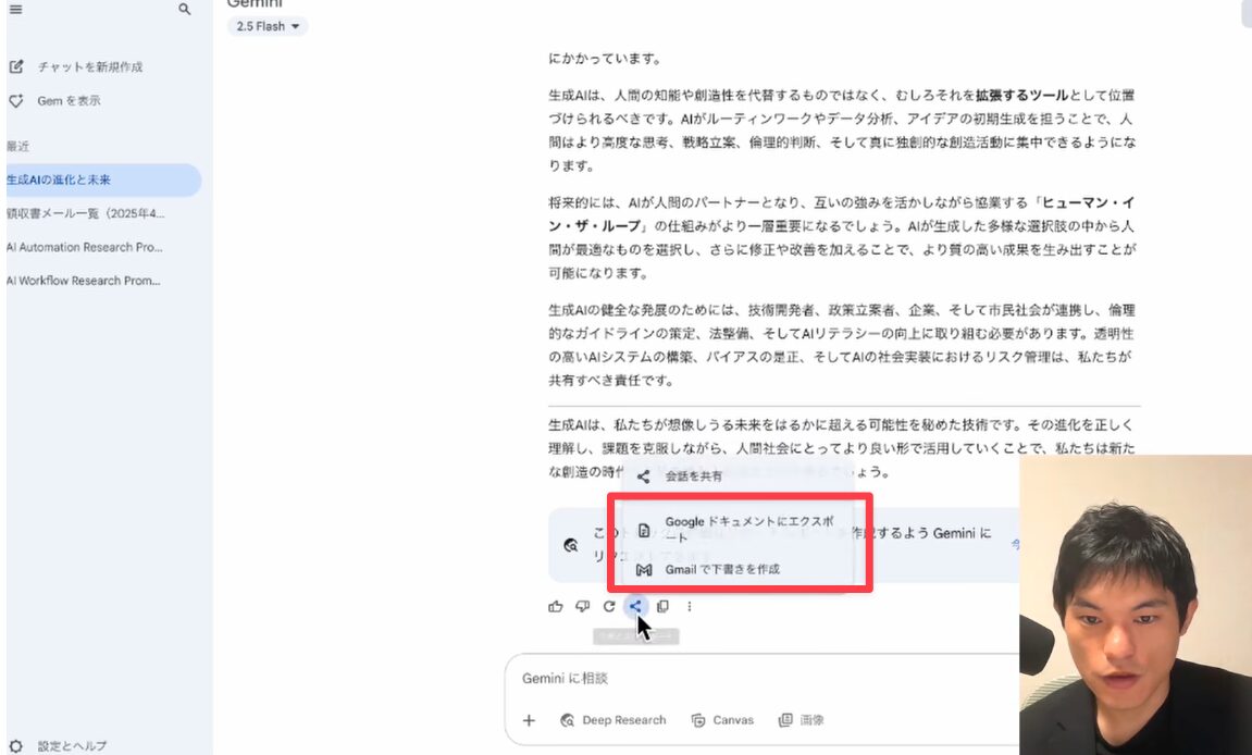リサーチした内容やGeminiが生成したレポートを、すぐにチームメンバーや関係者にメールで共有したい場合も、同様に「エクスポート」ボタンから「Gmailで下書きを作成」を選択します。すると、Geminiの回答内容が自動的にGmailの下書きとして作成され、宛先を設定し、必要に応じて内容を修正するだけで送信準備が整います。情報共有のスピードが格段に向上し、迅速な意思決定をサポートします。
