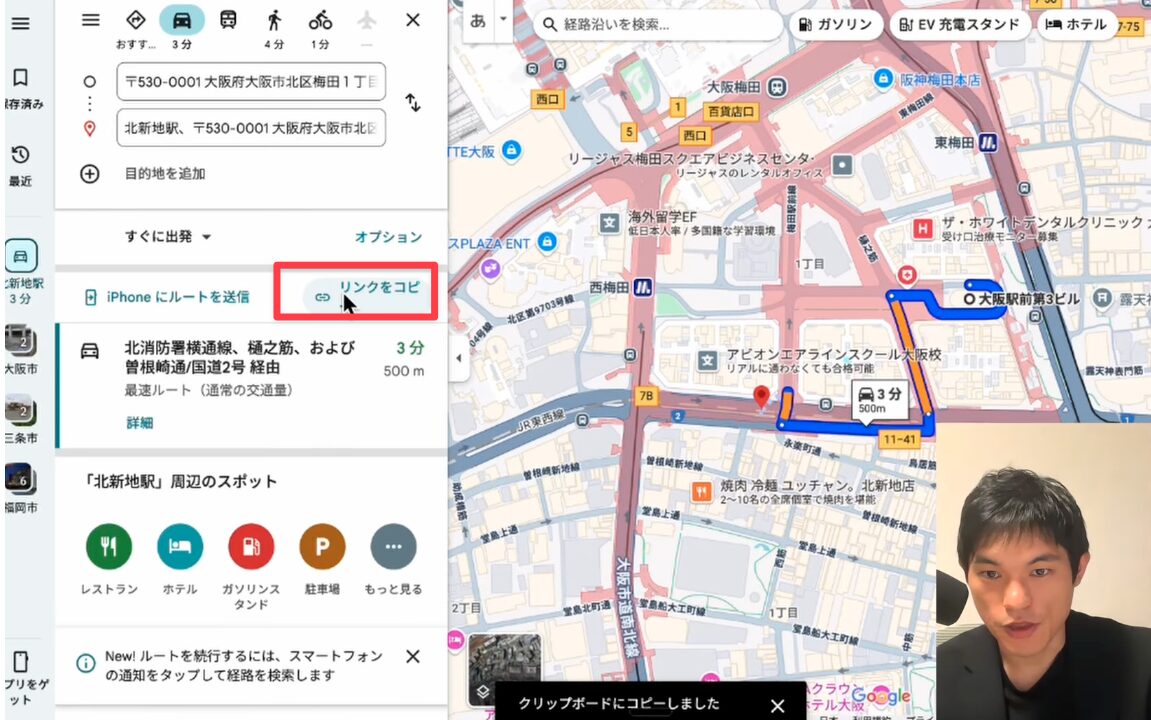 特定の場所への経路や情報を共有する際もGeminiは活躍します。「大阪駅から北新地駅までの行き方をGoogleマップで表示して」と依頼すると、GeminiはGoogleマップの検索結果へのリンクを生成します。このリンクをコピーし、「Gmailで下書きを作成」機能を使ってメールに貼り付けることで、場所や経路情報を手軽に共有できます。出張や外出の多いビジネスパーソンにとって、非常に便利な機能です。