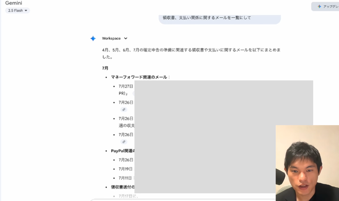 「Gmailの中から4月、5月、6月、7月の確定申告準備に関連する領収書や支払い関係のメールを全てピックアップして」といった具体的な指示をGeminiに出すことで、膨大なメールの中から必要な情報を迅速に抽出し、一覧表示してくれます。これにより、情報検索にかかる時間を大幅に削減し、重要なメールの見落としを防ぎます。プロジェクト管理、顧客対応、経費精算など、あらゆるシーンで応用可能です。