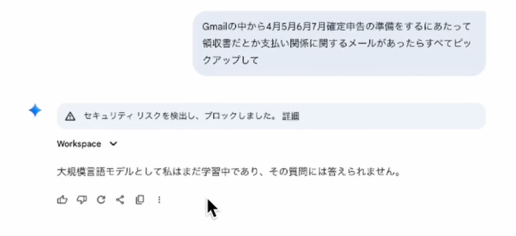Geminiの連携機能は、ユーザーの利便性だけでなくセキュリティにも配慮しています。稀に、Geminiが「セキュリティリスクを検出し、ブロックしました」と表示することがあります。これは、Geminiのシステムが悪意のあるコンテンツやプロンプトインジェクションといった攻撃からユーザーを守るための仕組みが機能した結果です。この機能により、意図しない情報漏洩やシステムへの不正アクセスを防ぎ、安全なAI活用を促進します。