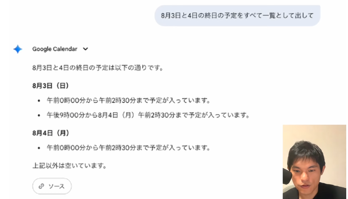 会議の調整やアポイントメントの設定は、多くの場合、相手の都合と自分の空き時間を照合する手間がかかります。Geminiに「Googleカレンダーを見て8月3日、4日の午後に2時間程度予定が空いているか、またその前後30分も空いているか確認して」と尋ねることで、AIがあなたのカレンダーを検索し、空き時間に関する情報を即座に教えてくれます。これにより、手動での確認作業が不要になり、スケジュール調整にかかる時間を大幅に短縮できます。