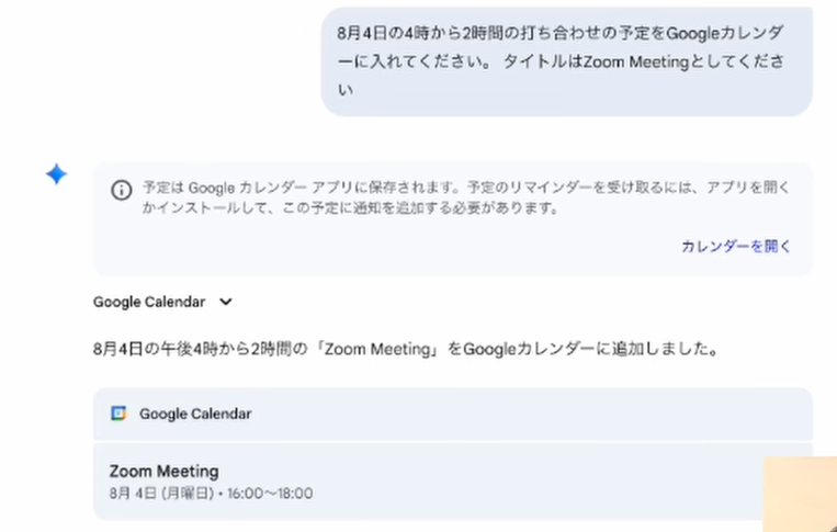 空き時間が確認できたら、そのままGeminiに予定の登録を依頼できます。「8月4日午後4時から2時間、ZoomミーティングというタイトルでGoogleカレンダーに予定を入れてください」と指示すれば、Geminiが自動的にカレンダーにイベントを追加します。これにより、別アプリを開いて手動で入力する手間が省け、作業の効率化とミスの軽減につながります。急な予定変更や追加にも、Geminiを介して迅速に対応できます。