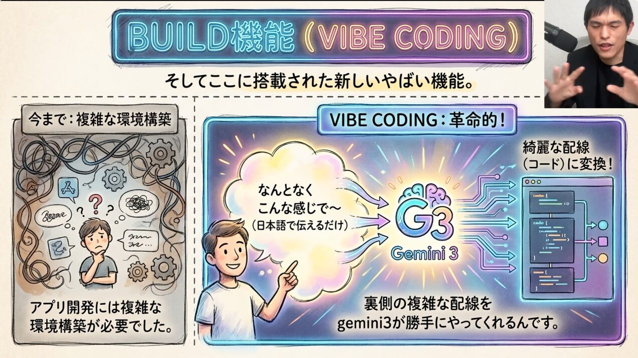 AIアプリ開発の最大の障壁の一つが、複雑なプログラミング言語と環境構築でした。しかし、Gemini Proの「バイブコーディング(Vive Coding)」機能は、この常識を覆します。バイブコーディングは、ユーザーが日本語のような自然言語で「こんなアプリが欲しい」「このように動いてほしい」と指示するだけで、Gemini Proが裏側の複雑なコード生成やUI設計、エラー修正まで自律的に処理してくれる革新的な機能です。