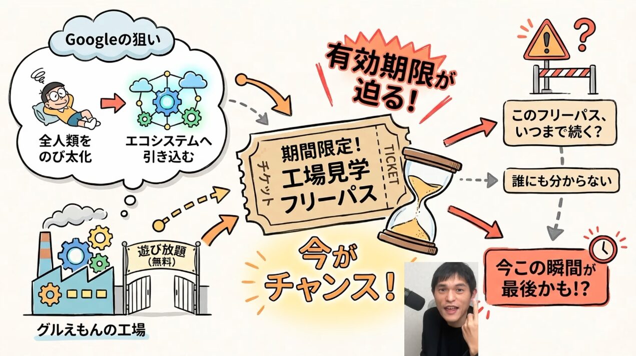 この太っ腹な提供は、Googleが「全人類をのび太化し、Googleのエコシステムに引き込みたい」という長期的なビジョンを持っているためです。個人のアイデアや小規模なプロジェクトであれば、無料枠内で十分に実現できるほどの自由度があり、AI開発へのハードルを極限まで下げています。これにより、金銭的な負担を気にすることなく、誰もが気軽にAIの可能性を探り、自分だけの「秘密道具」を創造できる環境が整えられています。