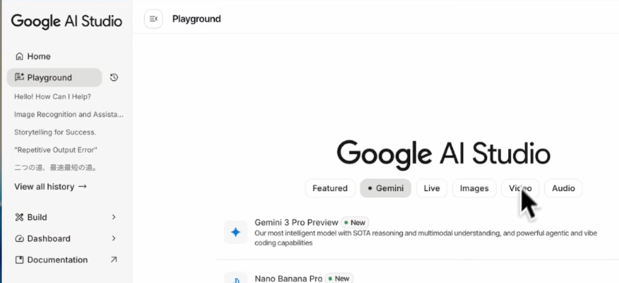 Google AI Studioにアクセスすると、主に「ホーム」「プレイグラウンド」「ビルド」の3つの主要機能があります。