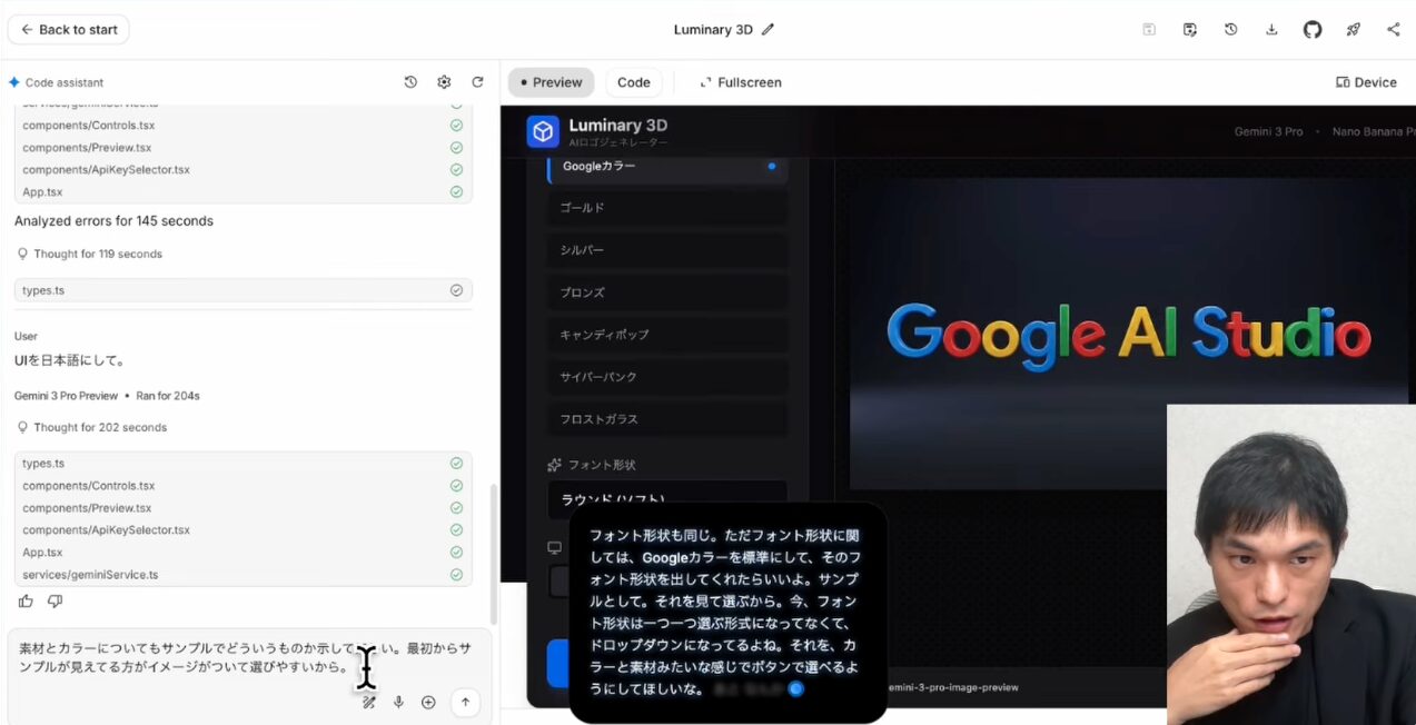 - UIと機能の調整: 初回生成されたアプリは、UIが英語だったり、フォントやカラーの選択肢が少なかったりすることがあります。そこで、追加のプロンプトで「UIを日本語に」「フォント形状は『角ばった形』『丸い形』『可愛い形』など複数選択可能に」「Googleカラー以外に銀色や金色なども選択肢に加えてほしい」といった具体的な改善要望を伝えます。