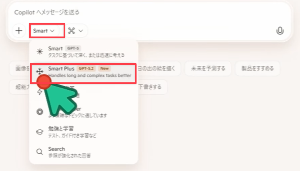 WindowsのWebブラウザ版Copilotでは、以下の手順でGPT-5.2を利用することが可能です。