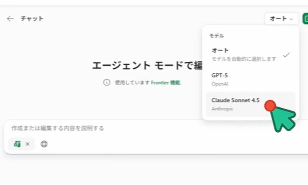 - エージェントモードが有効になると、チャット画面内に「AutoGPT-5」や「Claude Sonnet 4.5」といった選択肢が表示されます。ここで「Claude Sonnet 4.5」を選択することで、Copilot上でClaude 4.5が利用可能になります。