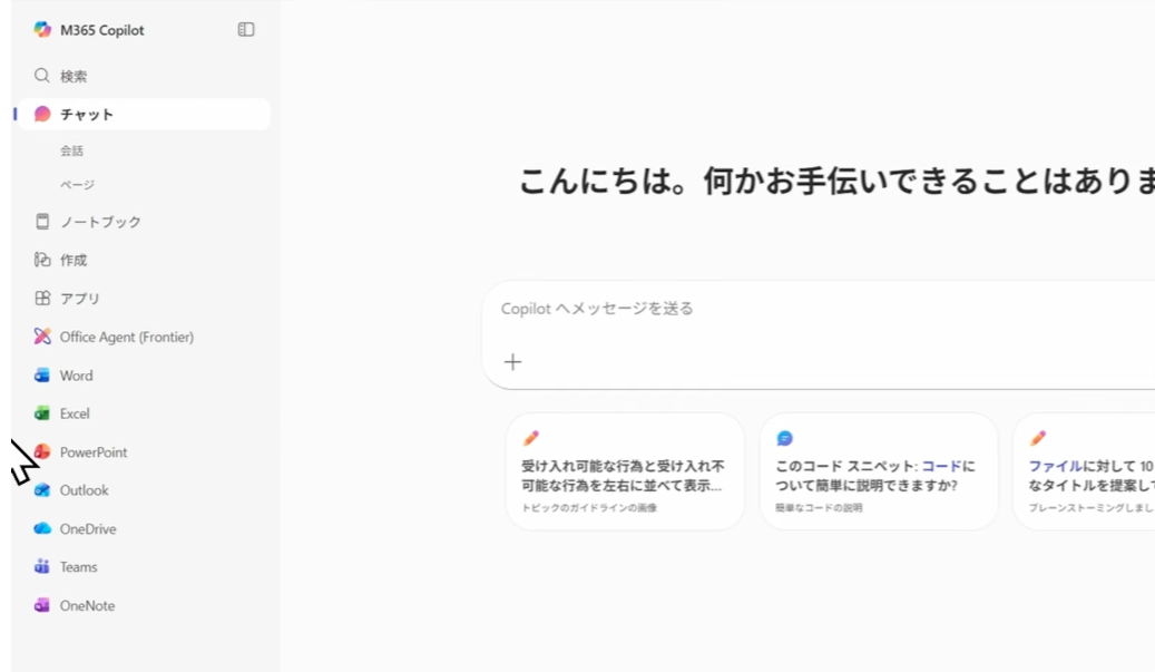 また、「Officeエージェントフロンティア」という機能も登場しており、これはチャット形式でWordやPowerPointのドキュメント作成を支援します。チャットを通じて「こんな企画書を作成してほしい」「この内容でスライドを生成してほしい」と指示することで、Copilotが自動的に構成を考え、ドキュメントやスライドを作成してくれる機能です。現時点ではWordとPowerPointに対応しており、Excelは含まれていません。