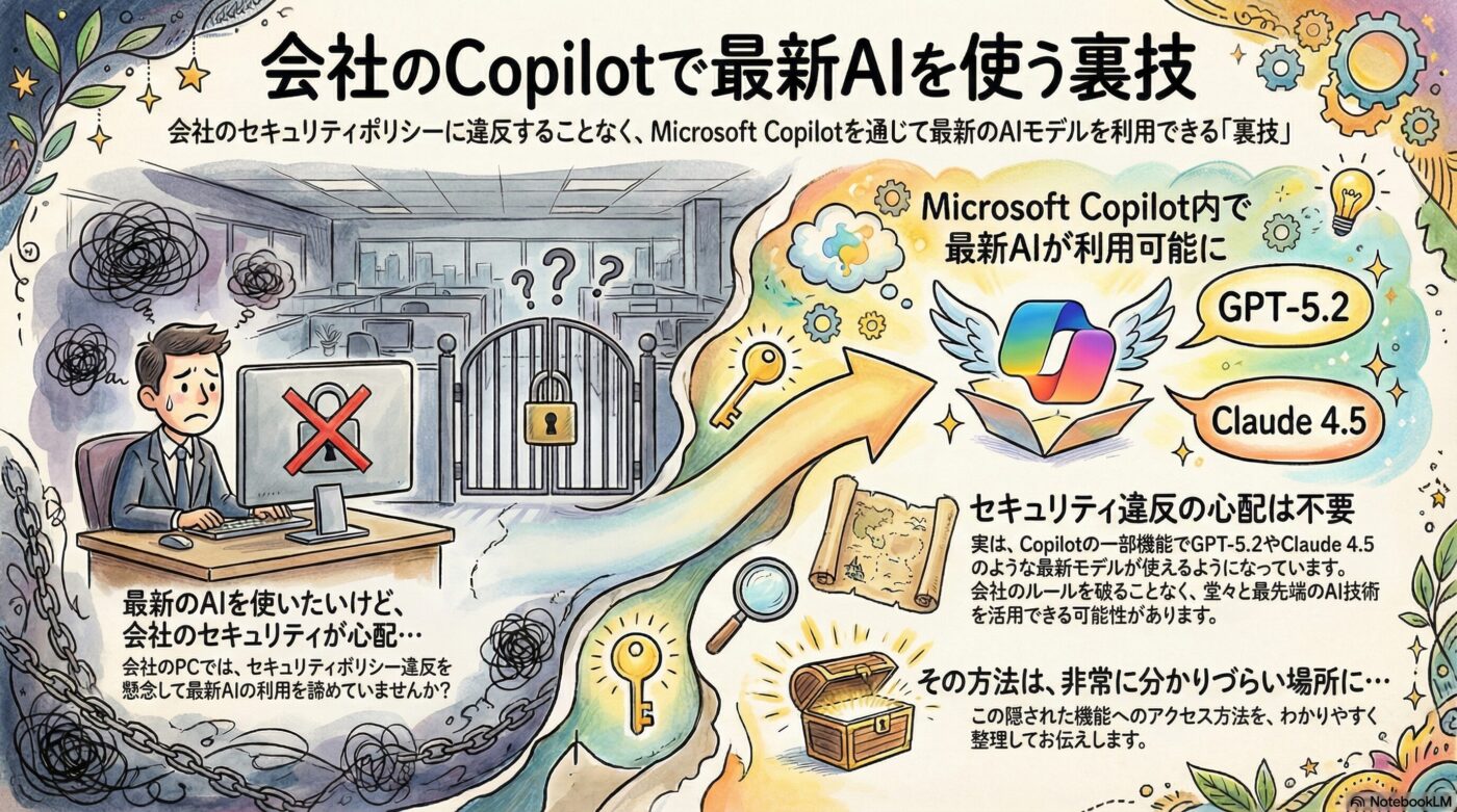 このような状況は、AI時代の到来に対する焦りや不安を生み出し、「このままではAIスキルが身につかず、時代に取り残されてしまうのではないか」という懸念を抱かせます。しかし、ご安心ください。あなたが毎日使っているMicrosoft Copilotには、実は最新のGPT-5.2やClaude 4.5を部分的に活用できる「裏技」が存在します。会社のセキュリティポリシーに違反することなく、これらの強力なAIモデルを業務に堂々と活用し、業務効率を劇的に向上させる道が開かれているのです。