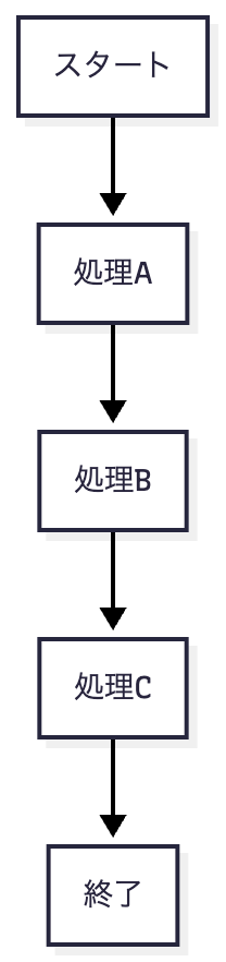 順次処理は、3大処理の中で最も基本となるものです。プログラムに書かれた命令(処理)を、上から下へ、書かれた順番どおりに、一つずつ実行していく処理の流れを指します。